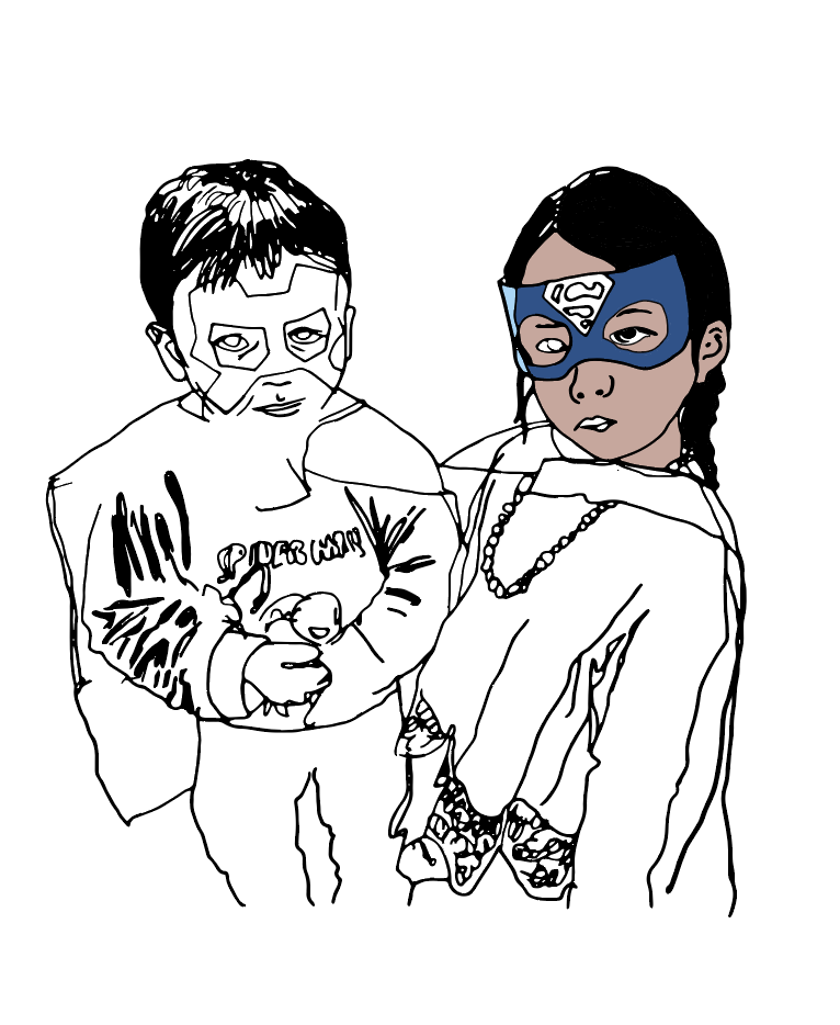 It's my niece's birthday today and I wanted to send her something a little special, so I decided to create this picture for her. I love this photo of her and her younger brother, Conor. It was taken in the front room of their home, and they are rocking their superhero costumes. The colours in this are great, so bright and vivid with loads going on in the background to do with the children. The remote control car, the toy boxes and and other bits and bobs give us a hint into their past games.